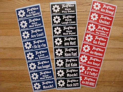 You've seen them in the Twifties Videos. Wear your Twifties Stickers so other fun people around their mid 40s and up will recognize you as a fellow Twifty...